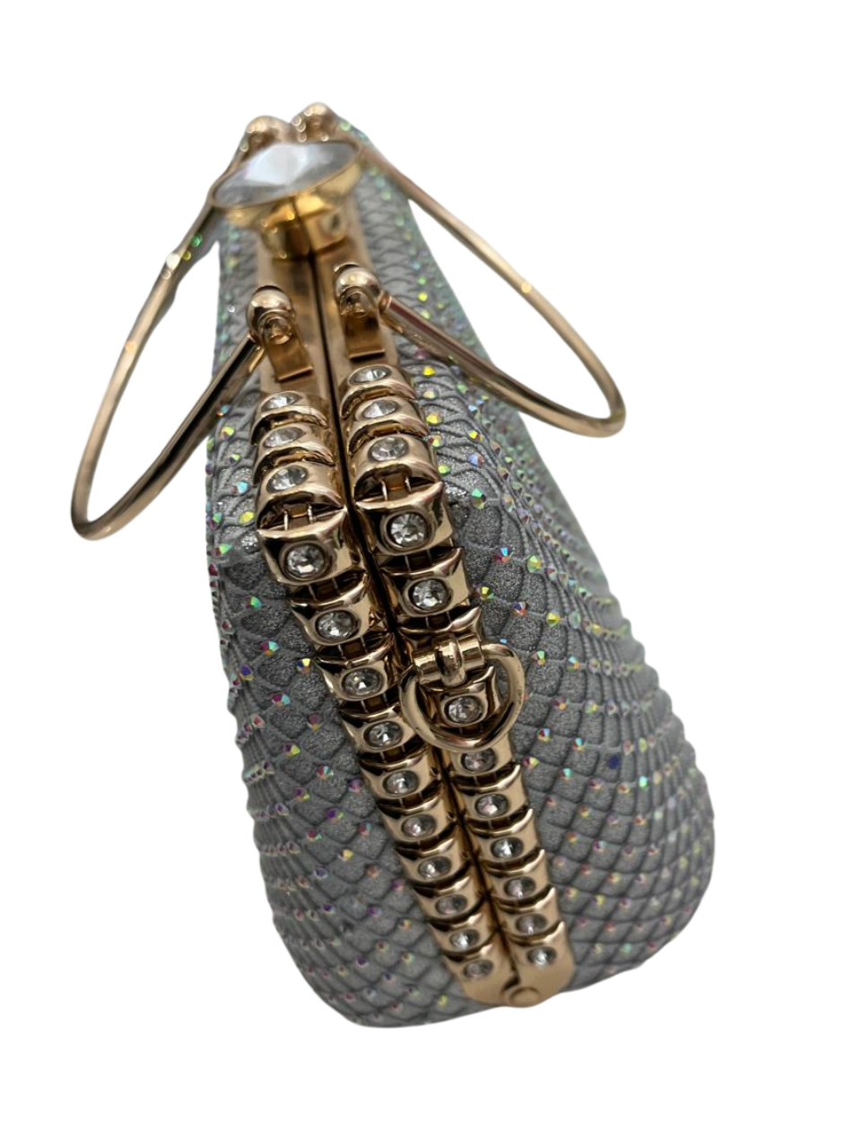 Step into luxury with this Designer Diamond-Studded Evening Clutch, crafted to elevate your look at every special occasion. Featuring a beautifully textured shimmering surface, this clutch is adorned with high-shine rhinestone studs on the side panels, giving it a rich and glamorous finish that instantly catches the eye.
